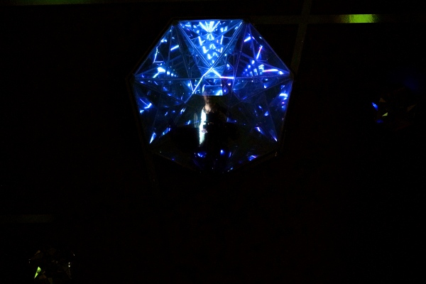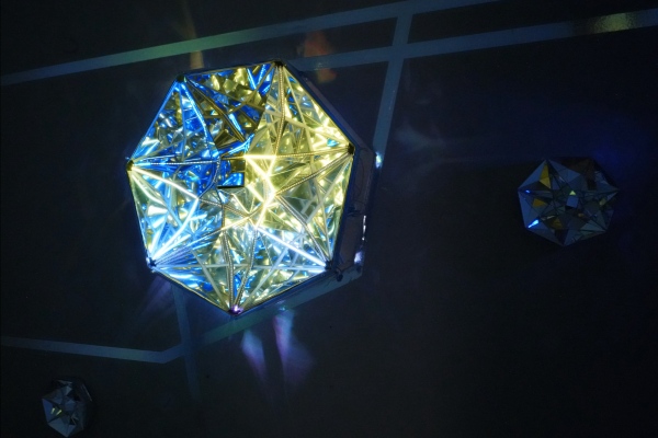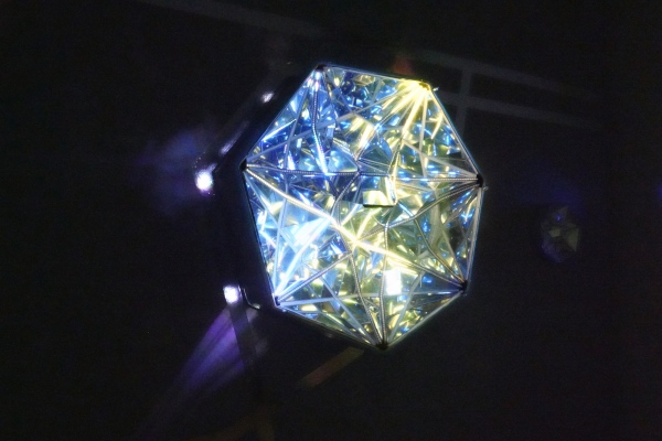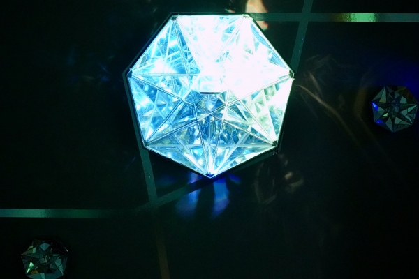 The light installation (sculpture) consists of more than 80 mirrors, and more than 900 light-emitting diodes animated 60 frames per second, creating the illusion of continuous luminous flux, and using a two-way mirror (the effect of an infinity mirror) the light is reflected infinitely many times, giving the flat glass top an endless depth.