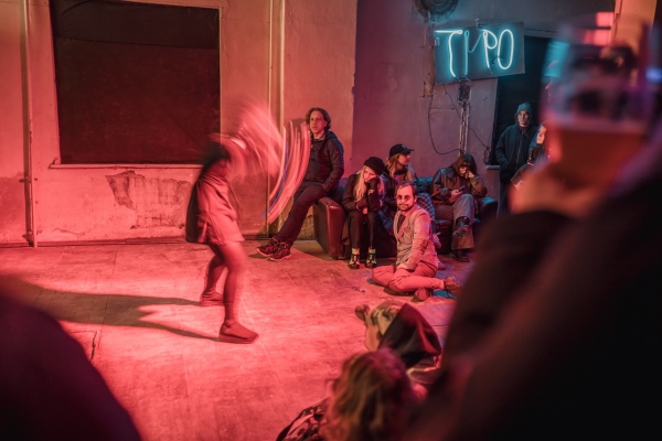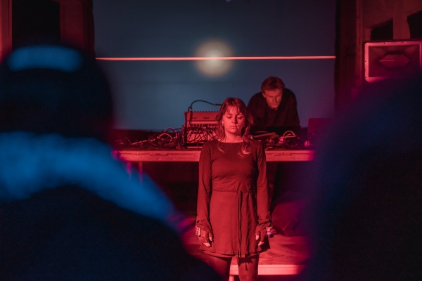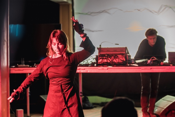Artist duo "Šūna⋅2": Kaspars Jaudzems (šūna) /sound & visuals/ Elza Zīverte (2) /movement improvisation & sound/In this performance the artist duo uses digital wireless sensors to track in real time heart (ECG) & body motion. Live data from the sensors is being sonified and visualized. The performance is an improvisation based on a loose script and live interaction between the artists. While Elza improvises the choreography by mainly listening to the sound, Kaspars executes codes on the fly (live-coding) that applies different algorithms mapping the data to create sound & visuals.